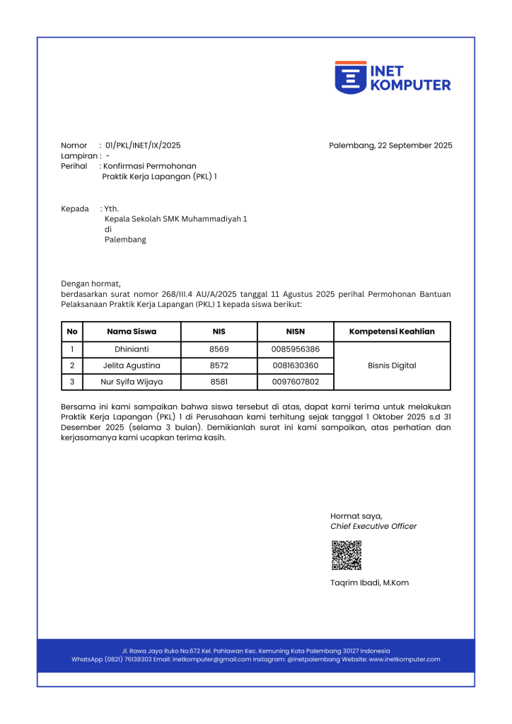Permohonan Siswa Magang SMK Muhammadiyah 1 – Bisnis Digital oleh Taqrim Ibadi | Sep 22, 2025 | Uncategorized | 0 Komentar Kirim Komentar Batalkan balasanAlamat email Anda tidak akan dipublikasikan. Ruas yang wajib ditandai *Komentar * Nama * Email * Situs Web Simpan nama, email, dan situs web saya pada peramban ini untuk komentar saya berikutnya. Beritahu saya akan tindak lanjut komentar melalui surel. Beritahu saya akan tulisan baru melalui surel. Δ